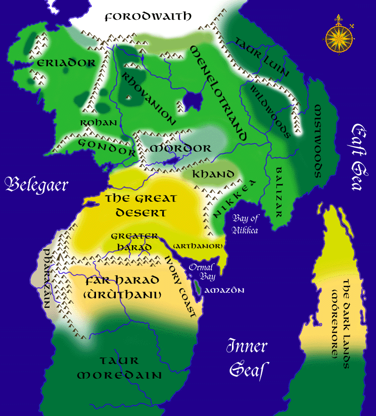 South of Gondor, across the river Harnen, lies the wide sand desert which is mentioned in the records of Gondor as the Near Harad, while the ancient Elven name for it is Lithaer, the Sea of Sand. It is a harsh and inhospitable land, 300 miles wide at its narrowest point, between Harnen and the river Siresha in the South.